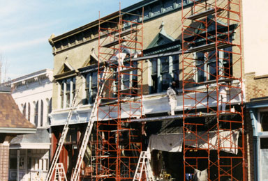 Earlier erected on this site was the Central Mill, built in 1866, and the Constitutional Presbyterian Church, built in 1845 was on the northeast portion of the site. The Central Mill continued to produce flour until 1898 when it was mostly destroyed by fire. Both the Central Mill and the Constitutional Presbyterian Church were demolished during the construction of the Central Building, one of the largest commercial buildings in St. Charles at the time. Traditional cast iron columns and wood framed windows identify the street level and the second story is uniquely decorated above the windows and at the cornice with pressed metal Italianate ornamentation. The Central Building remained in the Rechtern family ownership until 1983. |