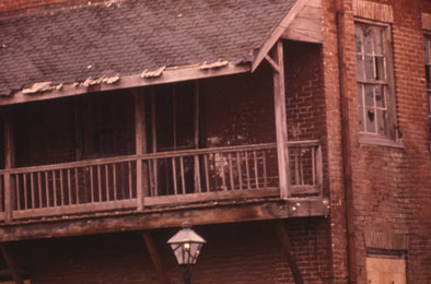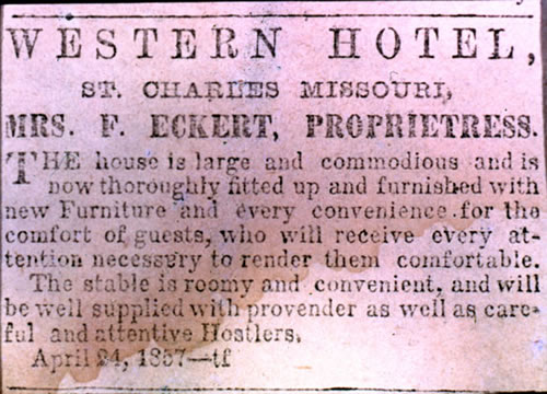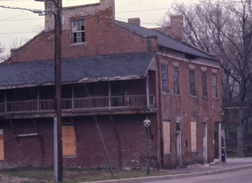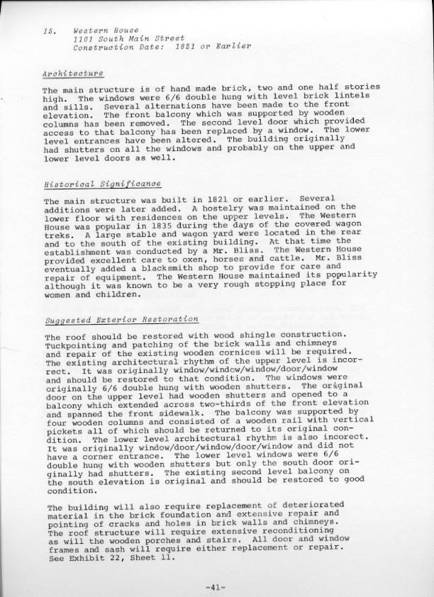 The main structure was built in 1821 or earlier. Several additions were later added. A hostelry was maintained on the lower floor with residences on the upper levels. The Western House was popular in 1835 during the days of the covered wagon treks. A large stable and wagon yard were located in the rear and to the south of the existing building. At that time the establishment was conducted by a Mr. Bliss. The Western House provided excellent care to oxen, horses and cattle. Mr. Bliss eventually added a blacksmith shop to provide for care and repair of equipment. The Western House maintained its popularity although it was known to be a very rough stopping place for women and children. (Booker & Associates)