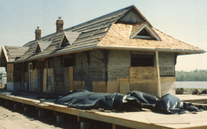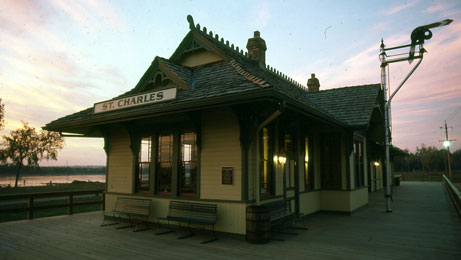 Flanked by two cabooses representing two of the railroads that have serviced St. Charles (the MKT and the Wabash), St. Charles’ Katy Depot sits in Frontier Park awaiting its next visitor. For years, the depot has been known as the M.K.T. Depot, so named after the railroad whose tracks used to stretch from the St. Charles County village of Machens to Pettis County’s Sedalia and beyond into Kansas and Texas. It once welcomed passengers riding the rails; but now it is a fixture in Frontier Park. In recent winters, the depot has become an ornament to a new main attraction in Frontier Park, a new Christmas tradition: the ice skating rink. During its lifetime, it has welcomed storytellers, artists, Civil War re-enactors, and tourists. The story of the depot has a few surprises and, like the railroad, some unexpected twists and turns. The history of the depot is a tale of the railroad, of urban renewal, and of historic preservation; it features a change of name for the railroad, a change of location, and a change in purpose. As a result of these changes, the depot has become a monument to railroad history.